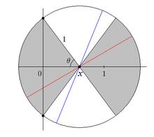 Let x and θ be as in the illustration in this section. Placing a needle's center at x, the needle will cross the vertical axis if it falls within a range of 2θ radians, out of π radians of possible orientations. This represents the gray area to the left of x in the figure. For a fixed x, we can express θ as a function of x: . Now we can let x move from 0 to 1, and integrate: