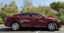 In January 2009, Buick unveiled the new 2010 LaCrosse sedan, an all new styling direction which included traditional Buick cues. The market responded positively to the LaCrosse and reviews favorably compared it luxury models such as the Lexus ES.[42] In 2010, Buick became the fastest growing automotive brand in America and attracted a younger customer demographic.[43] A GM company spokesman at the time said that Buick was positioned as a "premium" marque (entry-level luxury) to compete with various Acura, Infiniti, Lexus, and Volvo models, while Cadillac was aimed at the "luxury" performance segment which includes brands like BMW and Mercedes-Benz.[44] An all-new Regal sedan, a smaller model based on the European Opel Insignia, was re-introduced for the 2011 model year after a seven-year absence. For 2012, the all-new Verano, which was a compact sedan based on the Chevrolet Cruze, joined the lineup. Additionally, the performance-oriented Regal GS officially went on sale and became the first Buick in almost 20 years to be offered with a manual transmission and a turbocharger. Buick also entered the hybrid market with the introduction of eAssist technology on the 2012 LaCrosse and Regal which helped improve fuel economy ratings by as much as 38% over the regular gas-engine versions. Meanwhile, sales of the Enclave crossover remained strong. In January 2012, the all-new Encore mini crossover was unveiled at the North American International Auto Show in Detroit. Also in 2012, a turbocharged version of the Verano was introduced and the Enclave was redesigned for the 2013 model year. In 2013, GM confirmed plans of a "hybrid global brand" which includes Opel/Vauxhall and Buick using more synergies between the brands.[45][46] LaCrosse and Regal were refreshed for the 2014 model year. In 2015, the all-new Cascada subcompact convertible debuted at the North American International Auto Show in Detroit. In November, the all-new 2017 LaCrosse was shown at the Los Angeles Auto Show. Buick also confirmed that the Envision compact crossover would be sold in North America starting summer 2016. The Verano compact sedan was dropped from the Buick lineup in North America in 2017. With GM selling off the Opel/Vauxhall division to Group PSA in March 2017, Buick is expected to move away from sharing Opel model/designs upon the completion of the current generation vehicles.[47]