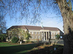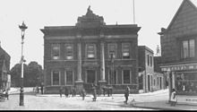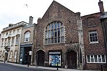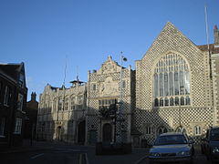 The town hall of King's Lynn (52°45′08″N 0°23′40″E / 52.7521°N 0.3945°E) has existed since the early fifteenth century, between 1422 and 1428,[17] when the Guildhall of the Holy Trinity was built. It is the most prominent feature of the town hall today with its steep arched roof, large window and chequered patterned exterior. The building was enlarged in 1624, when an extension with the same chequered style was added which now forms the main entrance to the town hall. The guildhall is a Grade I listed building.[18]