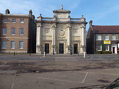 The East Gate originally stood near what is now known as Dodman's Bridge, near the College of West Anglia. Also known as St. Catherine's Gate, it was demolished in 1800 because the low arch was a hindrance to traffic. The stone was taken to Hillington Hall and used in the construction of the main gate, while the coat of arms that formerly adorned the East Gate is now above the entrance to King's Lynn court house.[51]