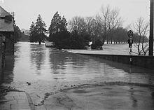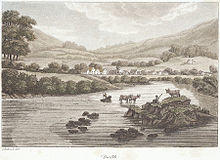 The 18th-century bridge at Builth Wells carries heavy vehicles on the A470. It has six fine masonry spans, with relatively small round cutwaters, which are fitted on the upstream side with stout steel fenders to provide protection from debris. The centre of the bridge has a pedestrian refuge on each side. The arches have been reinforced by a layer of concrete in the soffit.[12] The bridge was built in 1775 and widened in 1925. The river here marks the boundary between the old counties of Breconshire and Radnorshire.[13]