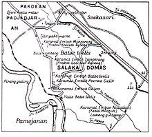 The first, and temporal, colonial settlement at Pakuan was a camp of lieutenant Tanoejiwa, a Sundanese employed by the VOC who was sent in 1687 to develop the area.[12][20][21] It was seriously damaged by the eruption on 4–5 January 1699 of the Mount Salak volcano (Indonesian: Gunung Salak). However, the concomitant forest fires removed much forest, leaving much area for the planned rice and coffee plantations.[12] In a short time, several agricultural settlements appeared around Pakuan, the largest being Kampung Baru (lit. "new village").[7] In 1701, they were combined into an administrative district; Tanoejiwa was chosen as the head of the district and is regarded as the founder of the modern Bogor Regency.[20][21]