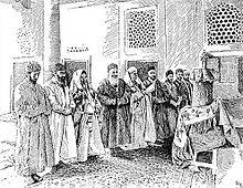 Around 1620, the first synagogue was constructed at Bukhara city. This was done in contravention of the law prescribed to Caliph Omar who forbade the construction of new non-Muslim places of worship including synagogues as well as forbade the destruction of those that existed in the pre-Islamic period. There was a case when Caliph Umar had ordered the destruction of a mosque, which was built illegally on Jewish land.[12][13][14] Before the construction of the first synagogue, Jews had shared a place in a mosque with Muslims. This mosque was called the Magoki Attoron (the "Mosque in pit"). Some say that Jews and Muslims worshipped alongside each other in the same place at the same time. Other sources insist that Jews worshipped after Muslims.[15] The construction of the first Bukhara synagogue was credited to two people: Nodir Divan-Begi, an important grandee, and an anonymous widow, who reportedly outwitted an official.