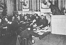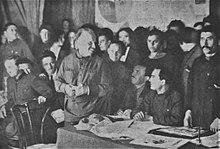 While no one dominated revolutionary politics in Moscow during the October Revolution as Trotsky did in St. Petersburg, Bukharin certainly was the most prominent leader in Moscow.[10] During the October Revolution, Bukharin drafted, introduced, and defended the revolutionary decrees of the Moscow Soviet. Bukharin then represented the Moscow Soviet in their report to the revolutionary government in Petrograd.[11] Following the October Revolution, Bukharin became the editor of the party's newspaper, Pravda.[12]