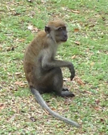 The crab-eating macaque (Macaca fascicularis), a species of monkey, is common in the reserve.[8] The monkeys also enter the area surrounding the park and are common enough that there are concerns that interactions with people will alter their behaviour.[6] Feeding the monkeys is prohibited, and visitors are urged to avoid staring at, baring teeth at or otherwise disturbing or threatening the monkeys.[6][8] Monkeys are not the only mammals in the park. Other mammals include the Malayan pangolin (Manis javanica), Malayan colugo (Galeopterus variegatus), plantain squirrel (Callosciurus notatus) and slender squirrel (Sundasciurus tenuis).[8] The colugos, which are generally nocturnal, can sometimes be seen clinging to trees during the day.[8] Bukit Timah is the only place in Singapore where the red-cheeked flying squirrel (Hylopetes spadiceus) is found.[8]