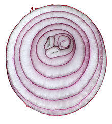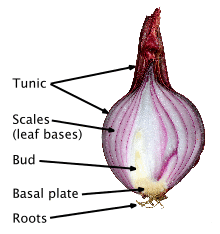The bulb's leaf bases, also known as scales, generally do not support leaves, but contain food reserves to enable the plant to survive adverse conditions. At the center of the bulb is a vegetative growing point or an unexpanded flowering shoot. The base is formed by a reduced stem, and plant growth occurs from this basal plate. Roots emerge from the underside of the base, and new stems and leaves from the upper side. Tunicate bulbs have dry, membranous outer scales that protect the continuous lamina of fleshy scales.[2] Species in the genera Allium, Hippeastrum, Narcissus, and Tulipa all have tunicate bulbs. Non-tunicate bulbs, such as Lilium and Fritillaria species, lack the protective tunic and have looser scales.[3]