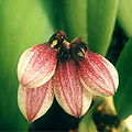 The erect to pendent inflorescence arises laterally from the base of the pseudobulb. The flower form has a basic structural blueprint that serves to identify this genus. But this form can be very diverse : compound or single, with few to many flowers, with the resupinate flowers arranged spirally or in two vertical ranks. The sepals and the petals can also be very varied : straight or turned down, without footstalk or with a long claw at the base. They are often hairy or callous. There are two to four hard and waxy pollinia with stipes present or absent. The fruits are beakless capsules.[5]