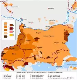 - ^ Национален Статистически Институт (2012). Преброяване на населението и жилищния фонд през 2011 година (in Bulgarian). Том 1: Население. София. pp. 33–34, 190. Of the 6.64 million people who answered the optional language question in the 2011 census, 5.66 million (or 85.2%) reported being native speakers of Bulgarian (this amounts to 76.8% of the total population of 7.36 million).