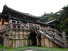The Cheongungyo (Blue Cloud Bridge, 청운교,靑雲橋) and Baegungyo (White Cloud Bridge, 백운교,白雲橋) Bridges of Bulguksa Temple are two bridges that are a part of a stairway that leads to the temple.[11] The bridges were probably built in 750 during the reign of King Gyeongdeok. Although built separately, they are designated together as one single national treasure. They were designated as the 23rd national treasure on December 20, 1962.