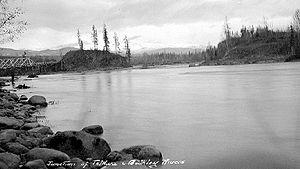 Simon McGillivray of the Hudson's Bay Company (HBC), who ventured into the northern part of the valley in 1833, is recorded as the first European visitor.[2] William Downie followed in 1859 while apparently surveying a possible transcontinental railway route.[3] Michael Byrnes (after whom Burns Lake is named) and Henry McNeill, Collins Overland Telegraph surveyors, were the first to travel the entire length of the valley. Charles S. Bulkley (after whom the river and valley are named) was the company chief engineer for construction, but not a site employee. By September 1866, the line had crossed the valley following the Bulkley to its junction with the Skeena River.[4] Following the successful completion of the transatlantic telegraph cable, work halted on the Collins telegraph in March 1867, and prompted its 1869 closure north of Quesnel.[5]