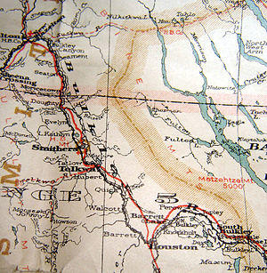 The anticipated railway link would remove many of the obstacles to growth.[15] Foley, Welch and Stewart (FW&S) began eastward construction of the Grand Trunk Pacific Railway (GTP) from Prince Rupert in 1908, reaching the valley in 1912.[16] The GTP had initially considered routing through the Telkwa Pass, 80 miles (130 km) shorter, largely bypassing the valley and the then major centre of Hazelton.[17] That year forest fires raged through the valley destroying crops, farm buildings and equipment as far west as Telkwa and Aldermere.[18]
