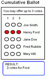- Cumulative voting allow up to N votes for N winner elections which can be distributed between multiple candidates or all given to one candidate. Effectively, this is one vote which can be fractionally divided among more than one candidate. This removes any penalty to bullet voters, who support a single candidate, and it enables the possibility of a united minority to elect at least one winner despite a united majority voting for all other candidates.