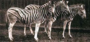 Burchell's zebra (Equus quagga burchellii) is a southern subspecies of the plains zebra. It is named after the British explorer and naturalist William John Burchell. Common names include the bontequagga, Damaraland zebra, and Zululand zebra (Gray, 1824).[1] Burchell's zebra is the only subspecies of zebra which may be legally farmed for human consumption.[2]