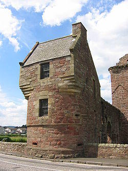 To the south-west is a 16th-century corner tower, two storeys high above a basement, which retains its roof. The tower is round at the base, and corbelled out to a square upper storey, and is a particularly fine and picturesque example of Scottish baronial architecture of the period. Its masonry is happily very well preserved. Both this tower and the keep have gun loops around the base to deter attackers. The corner tower also has small round pistol-holes at cap-house level, though these may have been included more for their decorative effect than to provide a true defensive capability. Engraved on the north gable is the date 1582, and the initials IB and MB,[1] for Sir James Balfour and his wife Margaret. The two towers are connected by a section of curtain wall pierced by an arched gate. Though now only a 'skin' of masonry, this wall once fronted a two-storey gatehouse. With its string-course, hood-mould over the gateway and moulded surround formerly containing a heraldic panel, this wall is an excellent example of small-scale but refined architectural sophistication of its period in Scotland (probably contemporary with the round corner tower). A defensive moat may have surrounded the barmkin in the past.