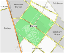 Burton is a small residential suburb approximately 21 kilometres north of the CBD of Adelaide, South Australia. It is located five km north-west of Salisbury in the flat terrain of the Adelaide Plains. The suburb contains two wetland reserves, including Kaurna Park.