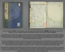 The earliest use of the written term bushidō is in the Kōyō Gunkan in 1616 by Kōsaka Masanobu.[1][10][11][12] In 1685, the ukiyo-e book Kokon Bushidō ezukushi (古今武士道絵つくし, "Images of Bushidō Through the Ages") by artist Hishikawa Moronobu (1618-1694) included the word bushido and artwork of samurai with simple descriptions meant for children.[1] In 1642, the Kashoki (可笑記, "Amusing Notes") was written by samurai Saito Chikamori and included moral precepts which explained the theoretical aspects of Bushido.[1][13] It was written with accessible kana syllabaries and intended for commoners, not warriors.[1] It was very popular among the common population.[1] It showed that bushido had spread among the population.[1] Thus the Kashoki shows that moral values were present in bushido by 1642.[1] The term bushido came into common international usage with the 1899 publication of Nitobe Inazō's Bushido: The Soul of Japan which was read by many influential western people.[14] In Bushido (1899), Nitobe wrote: