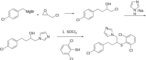 - ^ Walker KA, Braemer AC, Hitt S, Jones RE, Matthews TR (August 1978). "1-[4-(4-Chlorophenyl)-2-(2,6-dichlorophenylthio)-n-butyl]-1H-imidazole nitrate, a new potent antifungal agent". Journal of Medicinal Chemistry. 21 (8): 840–3. doi:10.1021/jm00206a028. PMID 357722.