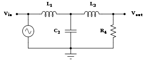 A simple example of a Butterworth filter is the third-order low-pass design shown in the figure on the right, with C2 = 4/3 F, R4 = 1 Ω, L1 = 3/2 H, and L3 = 1/2 H.[3] Taking the impedance of the capacitors C to be 1/(Cs) and the impedance of the inductors L to be Ls, where s = σ + jω is the complex frequency, the circuit equations yield the transfer function for this device:
