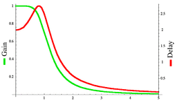 The group delay is defined as the derivative of the phase with respect to angular frequency and is a measure of the distortion in the signal introduced by phase differences for different frequencies. The gain and the delay for this filter are plotted in the graph on the left. It can be seen that there are no ripples in the gain curve in either the passband or the stop band.