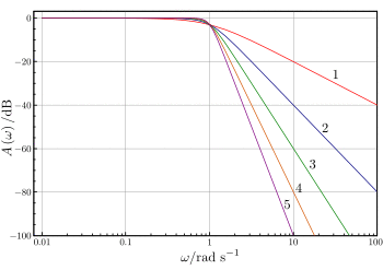 It can be seen that as n approaches infinity, the gain becomes a rectangle function and frequencies below ωc will be passed with gain , while frequencies above ωc will be suppressed. For smaller values of n, the cutoff will be less sharp.