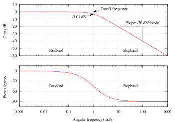 The frequency response of the Butterworth filter is maximally flat (i.e. has no ripples) in the passband and rolls off towards zero in the stopband.[2] When viewed on a logarithmic Bode plot, the response slopes off linearly towards negative infinity. A first-order filter's response rolls off at −6 dB per octave (−20 dB per decade) (all first-order lowpass filters have the same normalized frequency response). A second-order filter decreases at −12 dB per octave, a third-order at −18 dB and so on. Butterworth filters have a monotonically changing magnitude function with ω, unlike other filter types that have non-monotonic ripple in the passband and/or the stopband.