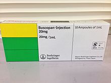 Hyoscine butylbromide, also known as scopolamine butylbromide[3] and sold under the brandname Buscopan among others,[4] is an anticholinergic medication used to treat crampy abdominal pain, esophageal spasms, renal colic, and bladder spasms.[5][6] It is also used to improve respiratory secretions at the end of life.[7] Hyoscine butylbromide can be taken by mouth, injection into a muscle, or into a vein.[4]