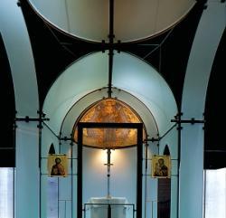 "The Byzantine Chapel Museum is a religious building whose purpose is to restore spiritual significance and function to two thirteenth-century Byzantine Frescoes, a dome and an apse, rescued and restored by the owner ... The materiality of the original chapel is shattered and made ephemeral through the fragmented, freestanding sandblasted laminated glass structure which is an abstracted evocation of the original chapel. The infinite is evoked through the play of darkness and light." François de Menil, May 1997[9]
