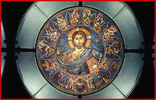 In the apse, the Virgin was depicted as flanked by the two archangels with a medallion on her breast of the infant Christ, symbolizing the Incarnation of Christ.[5]