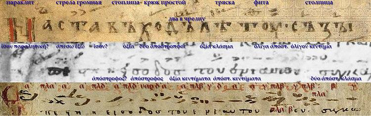 - "Athos, Monastery of the Great Lavra, Ms. γ 67". Incomplete Triodion, Pentekostarion and Oktoechos with Chartres notation (11th century).