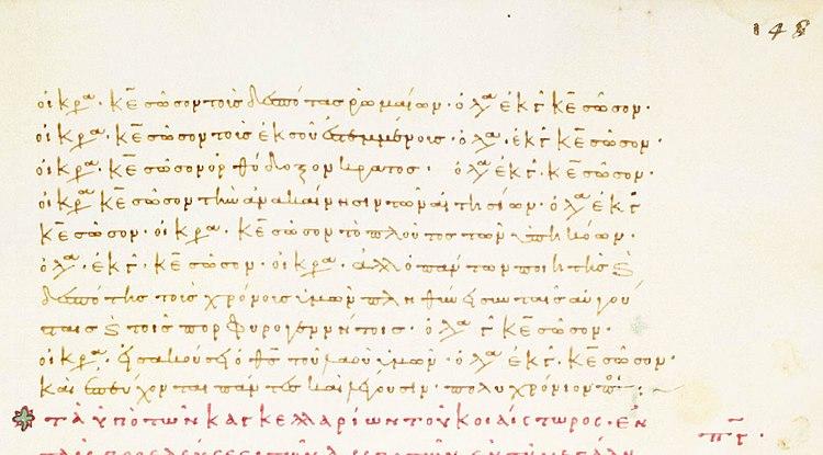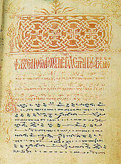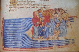 The main source about court ceremonies is an incomplete compilation in a 10th-century manuscript that organised parts of a treatise Περὶ τῆς Βασιλείου Τάξεως ("On imperial ceremonies") ascribed to Emperor Constantine VII, but in fact compiled by different authors who contributed with additional ceremonies of their period.[23] In its incomplete form chapter 1–37 of book I describe processions and ceremonies on religious festivals (many lesser ones, but especially great feasts such as the Elevation of the Cross, Christmas, Theophany, Palm Sunday, Good Friday, Easter and Ascension Day and feasts of saints including St Demetrius, St Basil etc. often extended over many days), while chapter 38–83 describe secular ceremonies or rites of passage such as coronations, weddings, births, funerals, or the celebration of war triumphs.[24] For the celebration of Theophany the protocol begins to mention several stichera and their echoi (ch. 3) and who had to sing them: