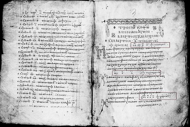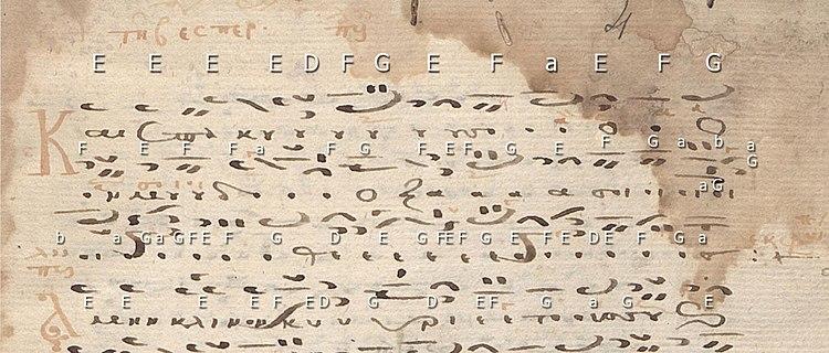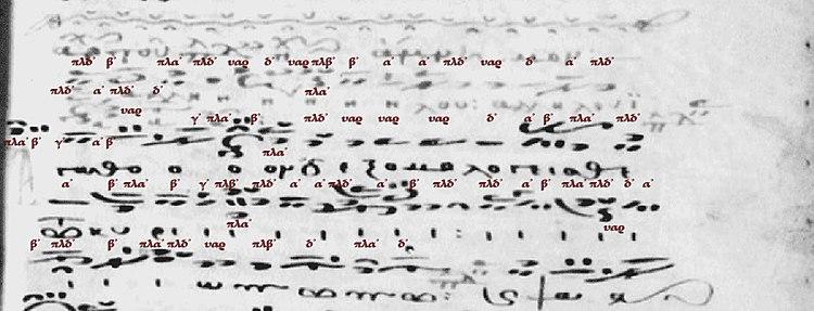- "Athos, Monastery of the Great Lavra, Ms. γ 74". Incomplete Menaion (beginning with 24 October) with Chartres notation (11th century).