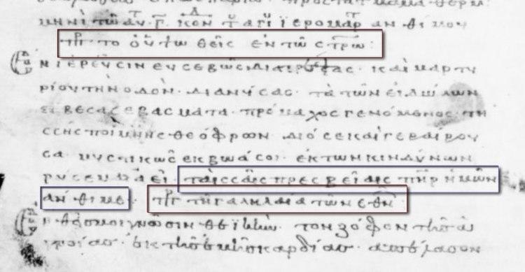 Δοχὴ πρώτη, τῶν Βενέτων, φωνὴ ἢχ. πλαγ. δ`. « Σήμερον ὁ συντρίψας ἐν ὕδασι τὰς κεφαλὰς τῶν δρακόντων τὴν κεφαλὴν ὑποκλίνει τῷ προδρόμῳ φιλανθρώπως. » Δοχἠ β᾽, τῶν Πρασίνων, φωνὴ πλαγ. δ'· « Χριστὸς ἁγνίζει λουτρῷ ἁγίῳ τὴν ἐξ ἐθνῶν αὐτοῦ Ἐκκλησίαν. » Δοχὴ γ᾽, τῶν Βενέτων, φωνἠ ἤχ. πλαγ. α'· « Πυρὶ θεότητος ἐν Ἰορδάνῃ φλόγα σβεννύει τῆς ἁμαρτίας. »[25]