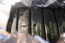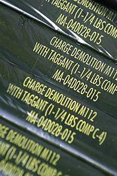 Military grade C-4 is commonly packaged as the M112 demolition block. The demolition charge M112 is a rectangular block of Composition C-4 about 2 by 1.5 inches (51 mm × 38 mm) and 11 inches (280 mm) long, weighing 1.25 lb (0.57 kg).[1][17] The M112 is wrapped in a sometimes olive color Mylar-film container with a pressure-sensitive adhesive tape on one surface.[18][19]
