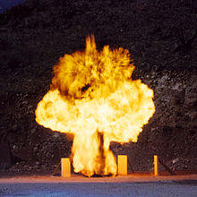 C-4 is very stable and insensitive to most physical shocks. C-4 cannot be detonated by a gunshot or by dropping it onto a hard surface. It does not explode when set on fire or exposed to microwaves.[13] Detonation can only be initiated by a shockwave, such as when a detonator inserted into it is fired.[8] When detonated, C-4 rapidly decomposes to release nitrogen, water and carbon oxides as well as other gases.[8] The detonation proceeds at an explosive velocity of 8,092 m/s (26,550 ft/s).[14]