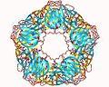 The CRP gene is located on chromosome 1 (1q23.2[15]). It is a member of the small pentraxins family. The monomer has 224 amino acids,[16] and molecular mass of 25,106 Da. In serum, it assembles into stable pentameric structure with a discoid shape.