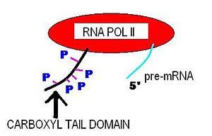 The C-terminal domain of some proteins has specialized functions. In humans, the CTD of RNA polymerase II typically consists of up to 52 repeats of the sequence Tyr-Ser-Pro-Thr-Ser-Pro-Ser.[1] This allows other proteins to bind to the C-terminal domain of RNA polymerase in order to activate polymerase activity. These domains are then involved in the initiation of DNA transcription, the capping of the RNA transcript, and attachment to the spliceosome for RNA splicing.[2]