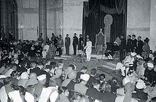 By the end of 1949, an assumption was made that Rajagopalachari, already governor-general, would continue as president.[41] Backed by Nehru, Rajagopalachari wanted to stand for the presidential election but later withdrew,[41][42] due to the opposition of a section of the Indian National Congress mostly made up of North Indians who were concerned about Rajagopalachari's non-participation during the Quit India Movement.[41][43][44][45]