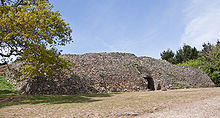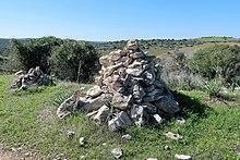 In Portugal a cairn is called a moledro. In a legend the moledros are enchanted soldiers, and if one stone is taken from the pile and put under a pillow, in the morning a soldier will appear for a brief moment, then will change back to a stone and magically return to the pile.[6] The cairns that mark the place where someone died or cover the graves alongside the roads where in the past people were buried are called Fiéis de Deus. The same name given to the stones was given to the dead whose identity was unknown.[7] The Fieis de Deus or Fes de Deus are, in the Galician legends, spirits of the night. The word "Fes" or "Fieis" is thought to mean fairy, the same root as "fate"[8] (fado), that can take the same meaning as the proto-Celtic *bāsto-, *bāsso-, meaning "death".[9]