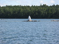 Coastal cairns called sea marks are also common in the northern latitudes, and are placed along shores and on islands and islets. Usually painted white for improved offshore visibility, they serve as navigation aids. In Sweden they are called kummel, in Finland kummeli, in Norway varde, and are indicated in navigation charts and maintained as part of the nautical marking system.[18] Inversely, they are used on land as sea cliff warnings in rugged and hilly terrain in the foggy Faroe Islands. In the Canadian Maritimes, cairns have been used as beacons like small lighthouses to guide boats, as depicted in the novel The Shipping News.