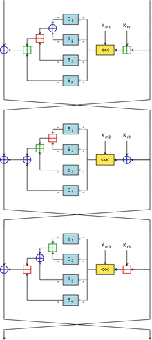 Components include large 8×32-bit S-boxes based on bent functions, key-dependent rotations, modular addition and subtraction, and XOR operations. There are three alternating types of round function, but they are similar in structure and differ only in the choice of the exact operation (addition, subtraction or XOR) at various points.