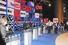 Leading up to the 2008 U.S. presidential election, CNN devoted large amounts of its coverage to politics, including hosting candidate debates during the Democratic and Republican primary seasons. On June 3 and 5, 2007, CNN teamed up with Saint Anselm College to sponsor the New Hampshire Republican and Democratic Debates.[40] Later that year, the channel hosted the first CNN/YouTube presidential debates, a non-traditional format where viewers were invited to pre-submit questions over the internet via the YouTube video-sharing service.[41] In 2008, CNN partnered with the Los Angeles Times to host two primary debates leading up to its coverage of Super Tuesday.[42] CNN's debate and election night coverage led to its highest ratings of the year, with January 2008 viewership averaging 1.1 million viewers, a 41% increase over the previous year.[42]
