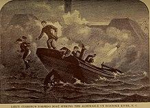The explosion threw Cushing and his men overboard into the water; Cushing then stripped off most of his uniform and swam to shore, where he hid undercover until daylight, avoiding the hastily organized Confederate search parties. The next afternoon, he was finally able to steal a small skiff and began slowly paddling, using his hands and arms as oars, down-river to rejoin Union forces at the river's mouth. Cushing's long journey was quite perilous and he was nearly captured and almost drowned before finally reaching safety, totally exhausted by his ordeal; he was hailed a national hero of the Union cause for his daring exploits. Of the other men in Cushing's launch, one man, Seaman Edward Houghton, also escaped, two others [A.M.M. John Woodman and 1/C fireman Samuel Higgins] were drowned following the explosion, and the remaining eleven were captured.[1]