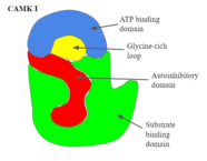 CAMK I, as shown in Figure 2, has a double-lobed structure, consisting of a catalytic, substrate-binding domain and an autoinhibitory domain.[1] For the autoinhibitory domain to become functional, it must cause the protein to conform in such a way that this domain completely blocks the substrate domain from taking in new targets. Figure 2 goes into detail showing the structure and domains of CAMK I.