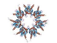 CAMK II has a variety of different forms, with CAMK 2A being the most common, as shown in Figure 3. CAMK 2A has a ring-like crystalline structure, composed of smaller functional groups. These groups allow for the CaM-dependent phosphorylation of targets, but also allows the structure to autophosphorylate itself and become CaM-independent,[8] as seen in Figure 1. This means once the CAMK 2A protein is initially activated by calcium or calmodulin, it can, in turn, further activate itself, so it doesn't become inactive even when it is without calcium or calmodulin.