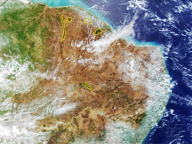 The ecoregion forms a series of discontinuous, island-like enclaves amongst the much larger and dry Caatinga xeric shrubland and thorn forests ecoregion and Cerrado subtropical savannas ecoregion.
