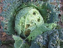 Pests include root-knot nematodes and cabbage maggots, which produce stunted and wilted plants with yellow leaves; aphids, which induce stunted plants with curled and yellow leaves; harlequin cabbage bugs, which cause white and yellow leaves; thrips, which lead to leaves with white-bronze spots; striped flea beetles, which riddle leaves with small holes; and caterpillars, which leave behind large, ragged holes in leaves.[64] The caterpillar stage of the "small cabbage white butterfly" (Pieris rapae), commonly known in the United States as the "imported cabbage worm", is a major cabbage pest in most countries. The large white butterfly (Pieris brassicae) is prevalent in eastern European countries. The diamondback moth (Plutella xylostella) and the cabbage moth (Mamestra brassicae) thrive in the higher summer temperatures of continental Europe, where they cause considerable damage to cabbage crops.[66] The cabbage looper (Trichoplusia ni) is infamous in North America for its voracious appetite and for producing frass that contaminates plants.[67] In India, the diamondback moth has caused losses up to 90 percent in crops that were not treated with insecticide.[68] Destructive soil insects include the cabbage root fly (Delia radicum) and the cabbage maggot (Hylemya brassicae), whose larvae can burrow into the part of plant consumed by humans.[66]