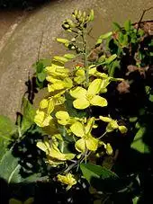 The inflorescence is an unbranched and indeterminate terminal raceme measuring 50–100 cm (20–40 in) tall,[13] with flowers that are yellow or white. Each flower has four petals set in a perpendicular pattern, as well as four sepals, six stamens, and a superior ovary that is two-celled and contains a single stigma and style. Two of the six stamens have shorter filaments. The fruit is a silique that opens at maturity through dehiscence to reveal brown or black seeds that are small and round in shape. Self-pollination is impossible, and plants are cross-pollinated by insects.[9] The initial leaves form a rosette shape comprising 7 to 15 leaves, each measuring 25–35 cm (10–14 in) by 20–30 cm (8–12 in);[13] after this, leaves with shorter petioles develop and heads form through the leaves cupping inward.[2]