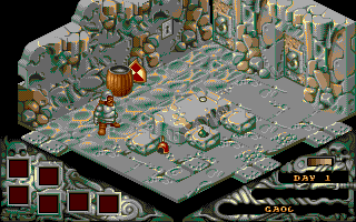When Karadoc touches an object, he can push it around, unless it is too heavy (a potion of strength allows pushing heavier objects). Touching an object also causes the context menu to be enabled. When the context menu is enabled, the fire button is used to select an action from the menu instead of jumping. The possible actions depend on the type of object, and are represented with icons. They include things like investigate, pull, pick up, drink, open, insert, give and some others. Items which are picked up land in Karadocs inventory, and get additional actions, like cast for spells. One item at a time also can be readied, usually a weapon, which makes the fire button throw or use the readied item instead of jumping.