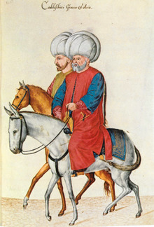 A kazasker or kadıasker (Ottoman Turkish: قاضی عسكر, ḳāḍī'asker, "military judge") was a chief judge in the Ottoman Empire, so named originally because his jurisdiction extended to the cases of soldiers, who were later tried only by their own officers.[1] Two kazaskers were appointed, called Rumeli Kazaskeri and Anadolu Kazaskeri, having their jurisdiction respectively over the European and the Asiatic part of the Empire. They were subordinated to the Grand Vizier, later Şeyhülislam, and had no jurisdiction over the city of Constantinople. Moreover, they attended the meetings at the Imperial Council.[2]