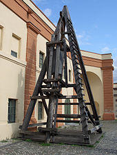 Caesar's first bridge was most likely built between Andernach and Neuwied, downstream of Koblenz. Book 4 (Liber IV) of his commentaries gives technical details of this wooden beam bridge. Double timber pilings were rammed into the river bottom by winching up a large stone and releasing it, thereby driving the posts into the riverbed. The most upstream and downstream pilings were slanted and secured by a beam, and multiple segments of these then linked up to form the basis of the bridge. Conflicting models have been presented based on his description.[1][2] Separate upstream pilings were used as protective barriers against flotsam and possible attacks while guard towers protected the entries. The length of the bridge has been estimated to be 140 to 400 m (roughly 460 to 1,300 ft), and its width 7 to 9 m (23 to 30 ft). The river is up to 9.1 m (30 ft) deep.